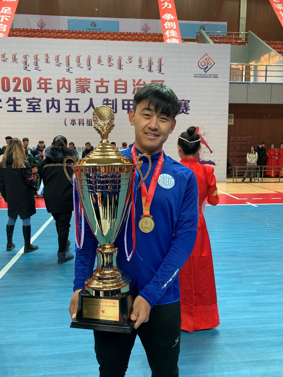 于2020年必赢242net官网主办内蒙古自治区大学生五人制足球赛中,通过教练员的指导,校领导的大力支持下,我校队员经过一星期的顽强拼搏,不惧受伤流血,秉承一个目标,齐心协力最终取得“内蒙古自治区大学室内生五人制甲级联赛赛”冠军的名次。在比赛与集训的过程中没有放弃学业,两边平衡,19学年平均绩点3.7,年级排名第4,体育成绩比较优秀,19学年正式成为必赢242net官网男子足球队超级组的队长。
