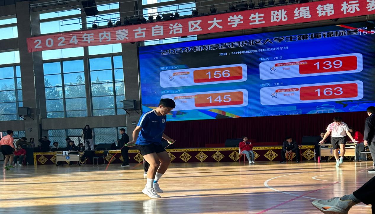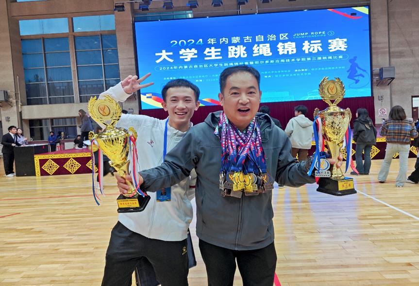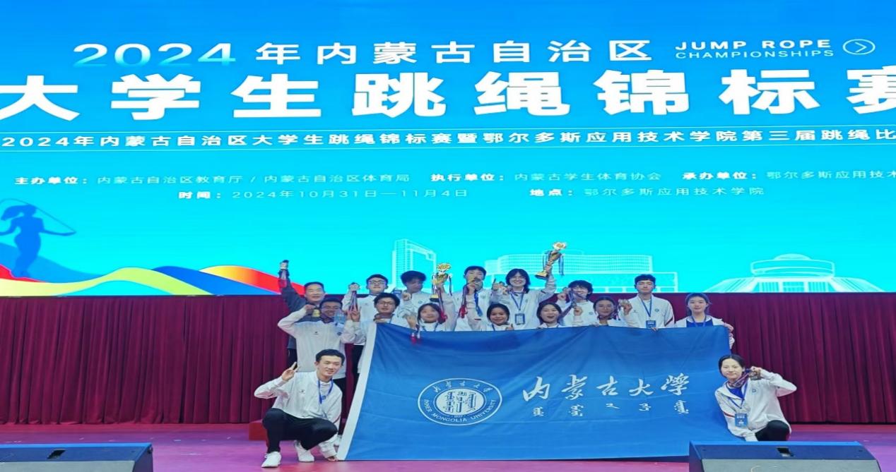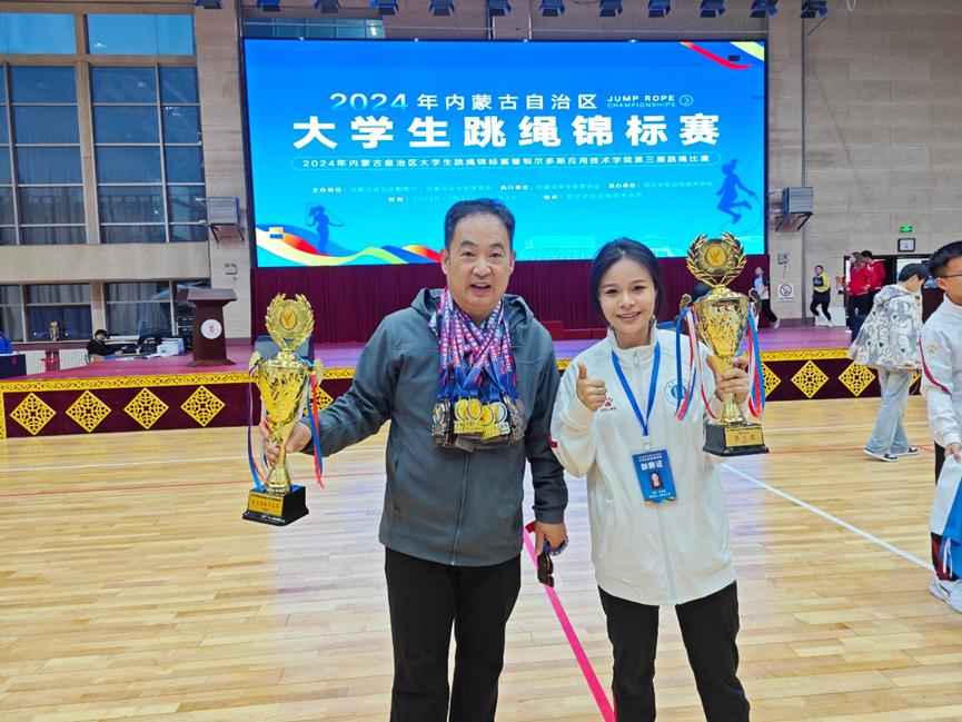 2024年11月1日,内蒙古自治区大学生跳绳锦标赛在鄂尔多斯应用技术学院启动。必赢242net官网跳绳队在副院长李慧君教授和教练薄惠敏老师的带领下,16名队员参赛,取得优异成绩:冠军1项,亚军3项,季军5项,第四名4项,第五名3项,团体总分第三名。