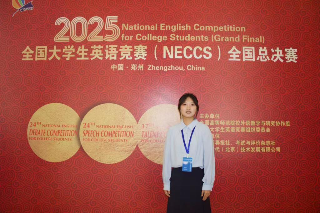 2025年8月7日全国大学生英语竞赛(NECCS)全国总决赛于郑州市圆满落幕。必赢运动训练专业学生崔浩宁在音体美组别全国总决赛中获两项三等奖,并被评为“优秀参赛选手”。必赢教师魏婷副教授担任崔浩宁的指导教师,获“优秀指导教师”奖。