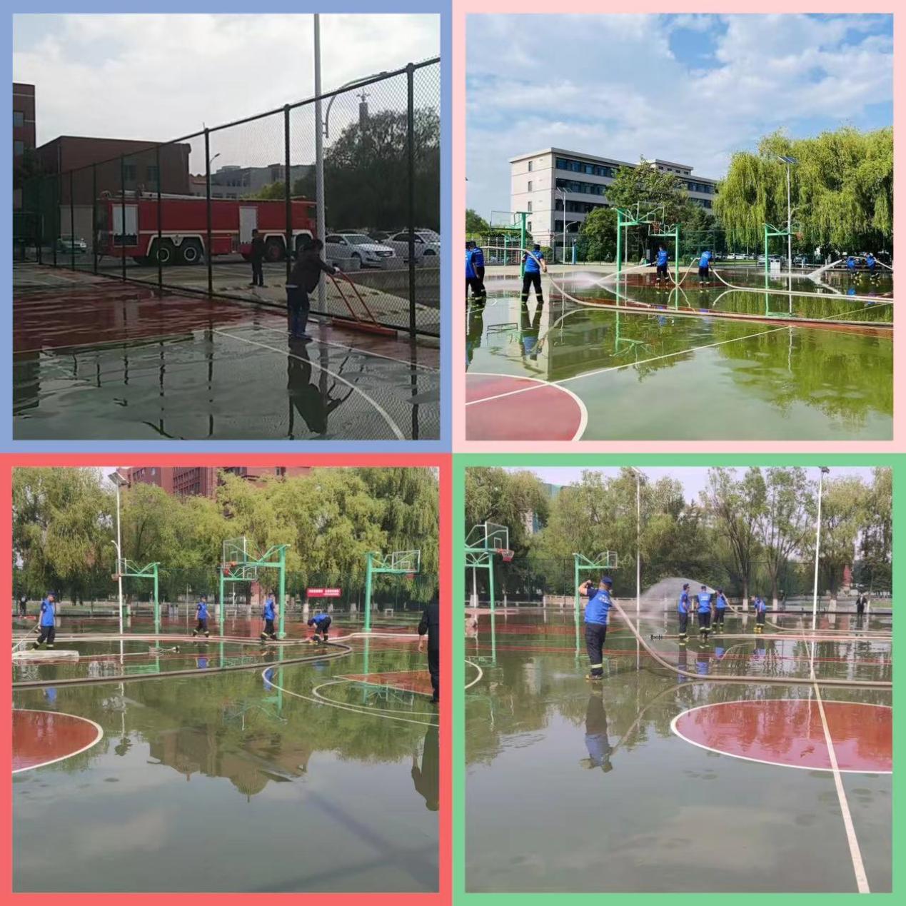 赛罕区山丹消防队派出三辆满载25吨水的消防车,队员8人,他们肩扛消防管,手握消防喷头,一遍又一遍的对塑胶地面进行冲洗,彻底把地表脏污冲洗干净,为师生教学、运动创造了一个良好的环境。场馆中心北校区职工在中心主任吴玉保的带领下参加了清洗工作。