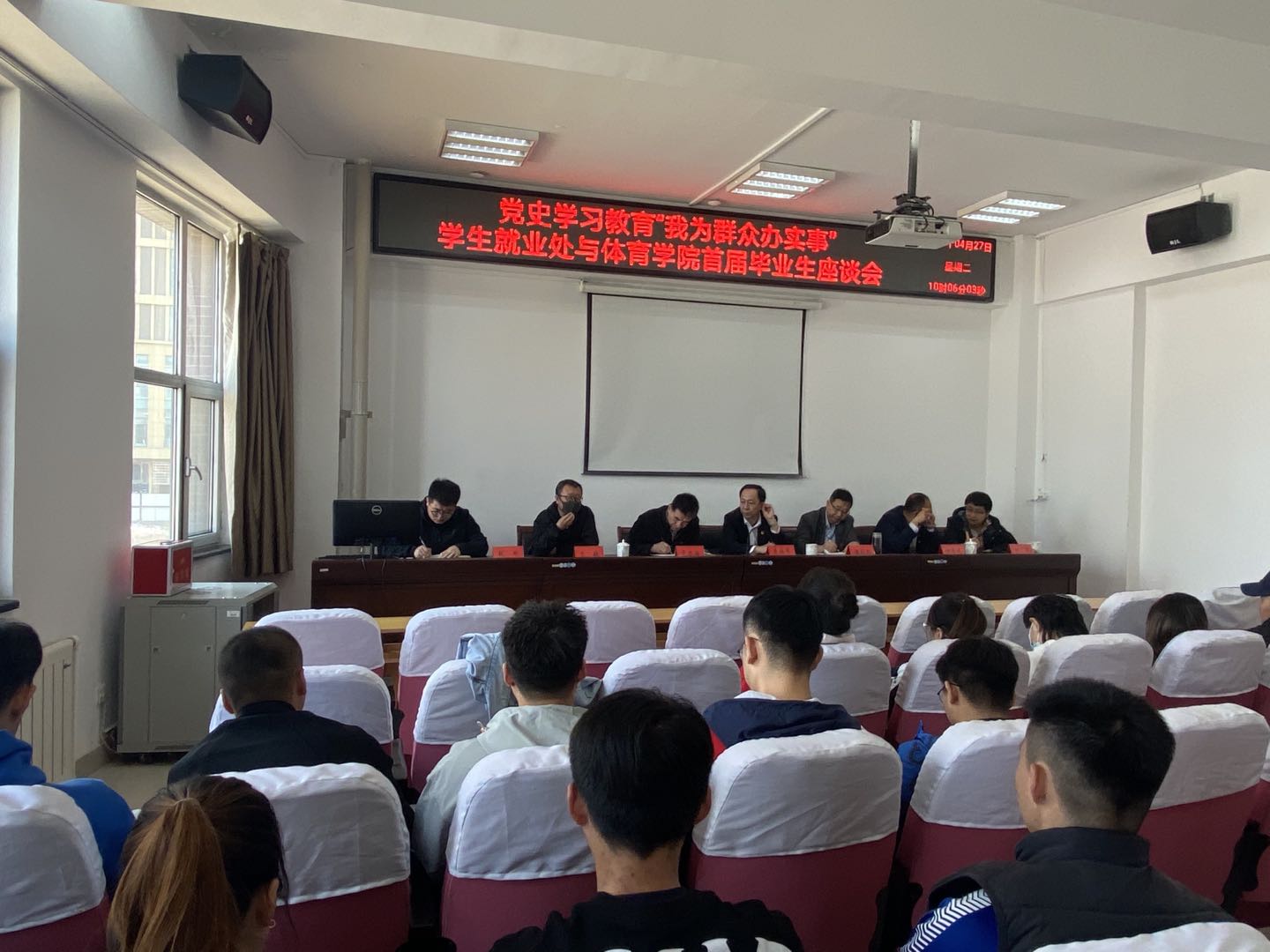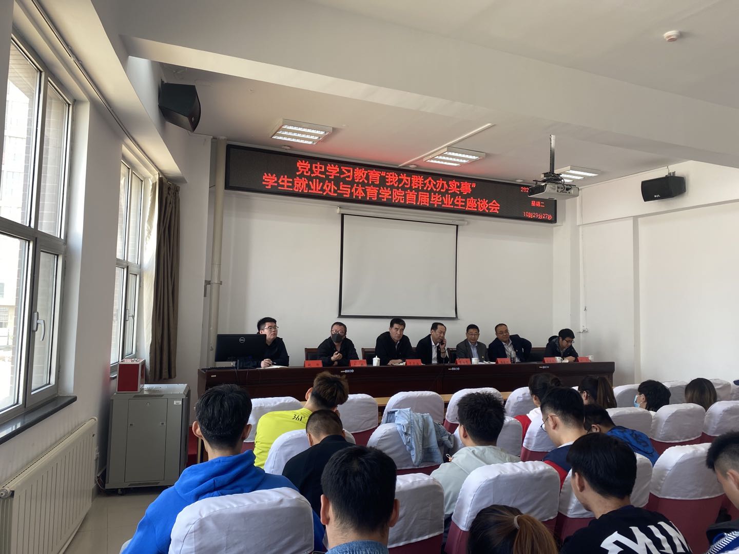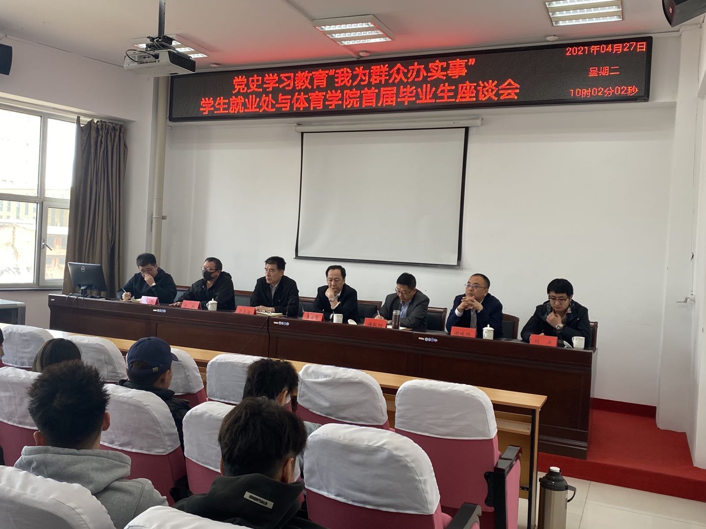 2021年4月27日上午9:30,学生就业处与必赢242net官网在体育馆205室联合开展了以“党史学习教育,我为群众办实事”为主题的首届毕业生座谈会。本次座谈会由必赢242net官网党总支书记温毅刚主持,参会成员有曹海鹰、温毅刚、于志海、谢峻鹏、于轶、刘关、赵郑、刘忠良老师及2017级全体学生,会上为同学解答就业中存在困惑,并提供了就业方面的指导。