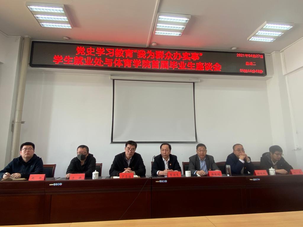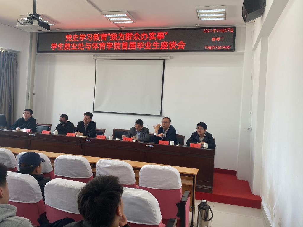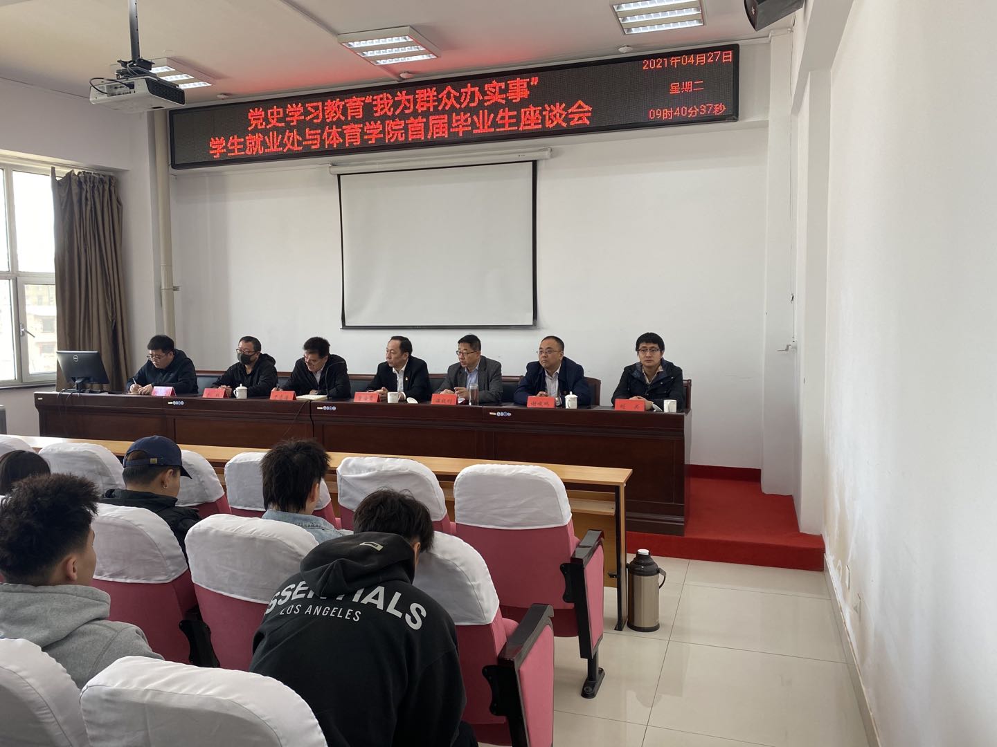 2021年4月27日上午9:30,学生就业处与必赢242net官网在体育馆205室联合开展了以“党史学习教育,我为群众办实事”为主题的首届毕业生座谈会。本次座谈会由必赢242net官网党总支书记温毅刚主持,参会成员有曹海鹰、温毅刚、于志海、谢峻鹏、于轶、刘关、赵郑、刘忠良老师及2017级全体学生,会上为同学解答就业中存在困惑,并提供了就业方面的指导。