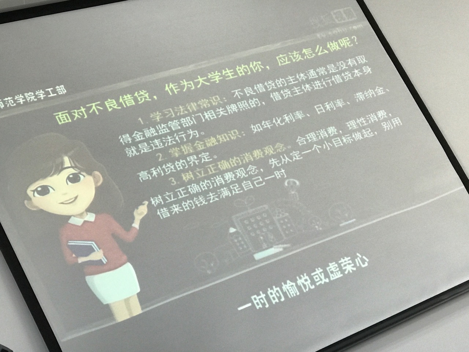 班会开始,刘老师向同学们展示了网络贷款的危害,通过网贷的一些实例让同学们认识到了网上贷款带给人们的危害,使同学们深入了解网上贷款,加强同学们对网上贷款的警惕,让同学们不受网上贷款的困扰,拒绝网贷防止受骗,在平时的学习和生活中,提高安全防范意识,加强自我保护能力。针对性地进行教育,使学生防患于未然,保证学生有一个安全的学习环境,健康的度过大学的每一天。